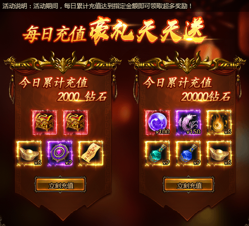 活动期间,每日累计充值达到指定金额即可领取超多奖励!