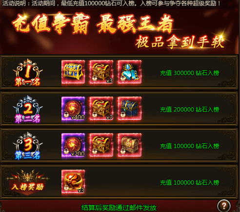 活动期间,最低充值100000钻石可入榜。入榜可参与争夺各种超级奖励!