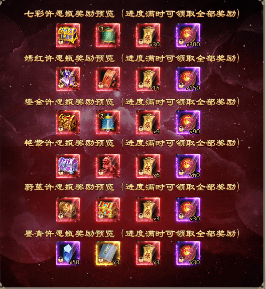 活动期间,许愿即可随机获得珍稀道具奖励且积攒许愿瓶进度,对应的许愿瓶进度满时,可一次性领取许愿瓶内所有奖!