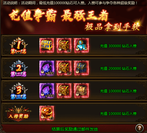 活动期间,最低充值100000钻石可入榜。入榜可参与争夺各种超级奖励!