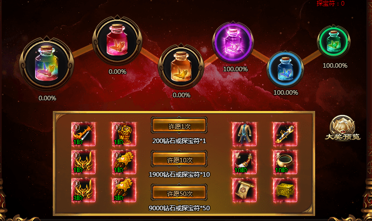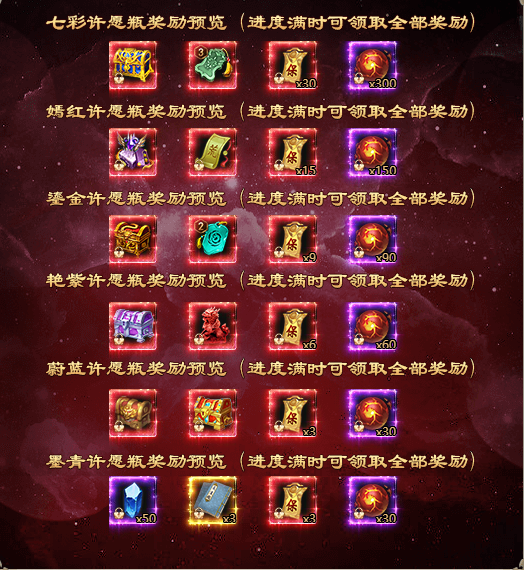 活动期间,许愿即可随机获得珍稀道具奖励且积攒许愿瓶进度,对应的许愿瓶进度满时,可一次性领取许愿瓶内所有奖!