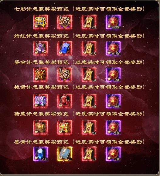 活动期间,许愿即可随机获得珍稀道具奖励且积攒许愿瓶进度,对应的许愿瓶进度满时,可一次性领取许愿瓶内所有奖!