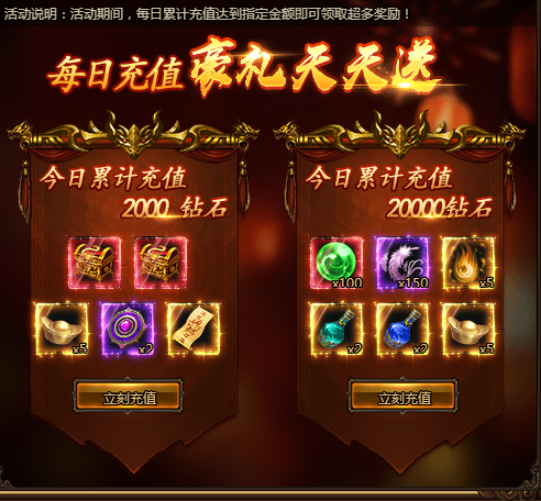 活动期间,每日累计充值达到指定金额即可领取超多奖励!