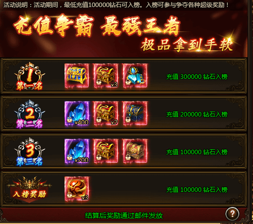 活动期间,最低充值100000钻石可入榜。入榜可参与争夺各种超级奖励!