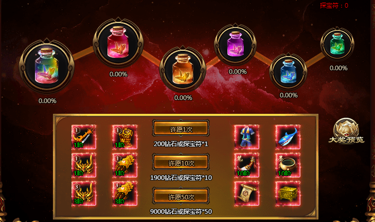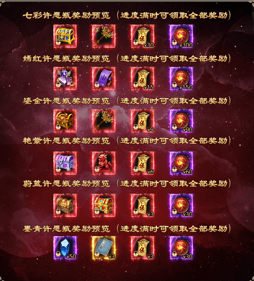 活动期间,许愿即可随机获得珍稀道具奖励且积攒许愿瓶进度,对应的许愿瓶进度满时,可一次性领取许愿瓶内所有奖!