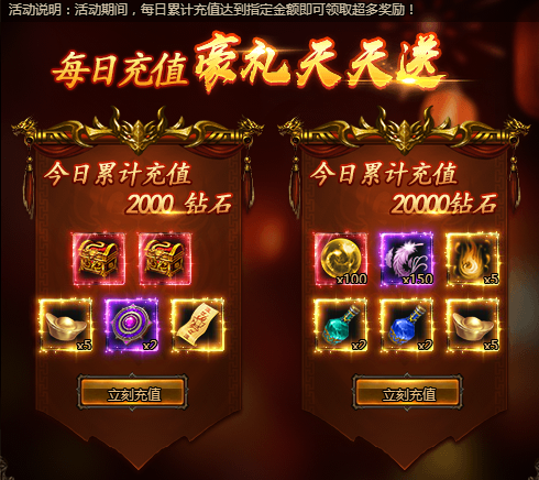 活动期间,每日累计充值达到指定金额即可领取超多奖励!