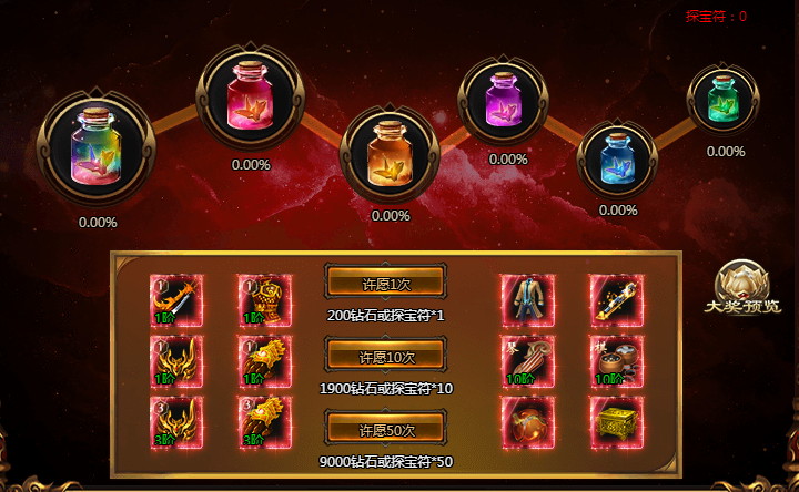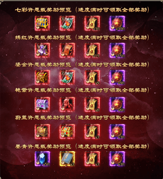 活动期间,许愿即可随机获得珍稀道具奖励且积攒许愿瓶进度,对应的许愿瓶进度满时,可一次性领取许愿瓶内所有奖!