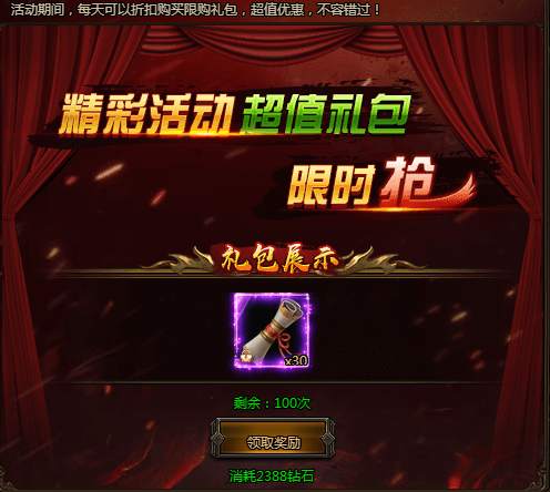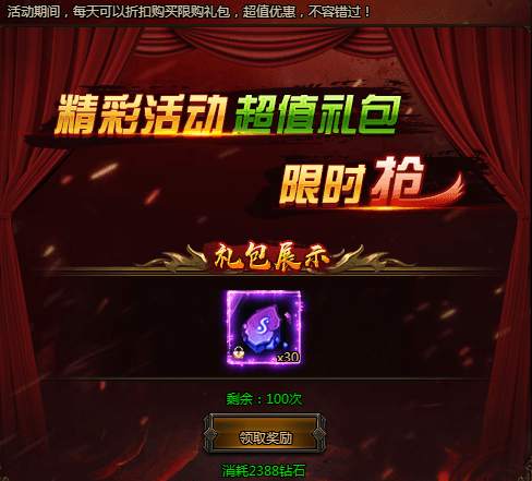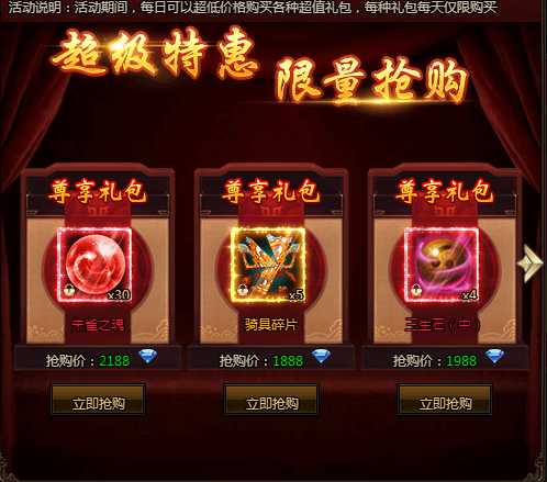 活动期间,每日可以超低价格购买各种超值礼包,每种礼包每天仅限购买!