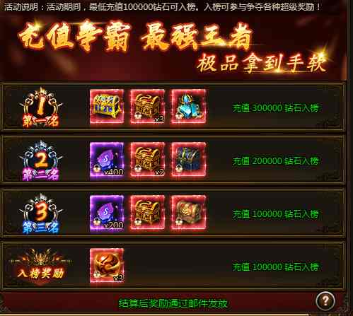 活动期间,最低充值100000钻石可入榜。入榜可参与争夺各种超级奖励!