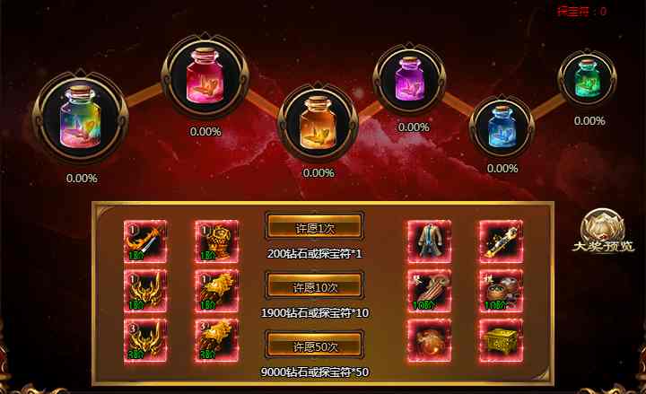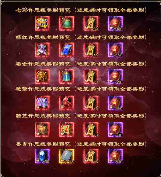 活动期间,许愿即可随机获得珍稀道具奖励且积攒许愿瓶进度,对应的许愿瓶进度满时,可一次性领取许愿瓶内所有奖!