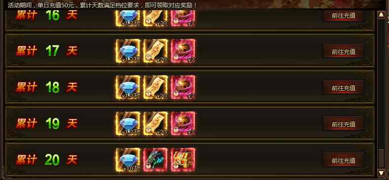 活动期间,每日累计充值达到指定金额即可领取超多奖励!
