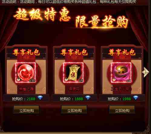 活动期间,每日可以超低价格购买各种超值礼包,每种礼包每天仅限购买!
