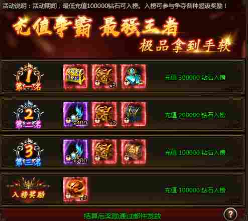 活动期间,最低充值100000钻石可入榜。入榜可参与争夺各种超级奖励!