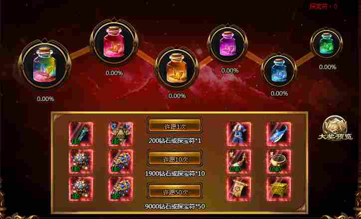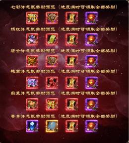 活动期间,许愿即可随机获得珍稀道具奖励且积攒许愿瓶进度,对应的许愿瓶进度满时,可一次性领取许愿瓶内所有奖!