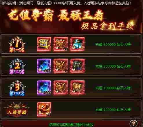 活动期间,最低充值100000钻石可入榜。入榜可参与争夺各种超级奖励!