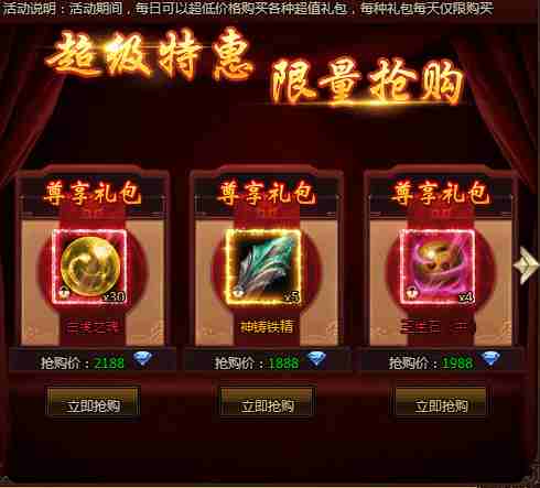 活动期间,每日可以超低价格购买各种超值礼包,每种礼包每天仅限购买!