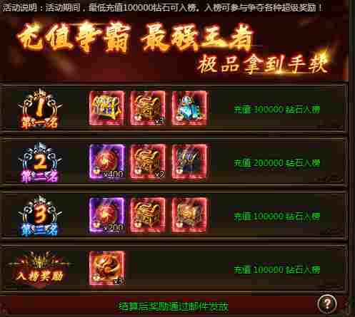 活动期间,最低充值100000钻石可入榜。入榜可参与争夺各种超级奖励!