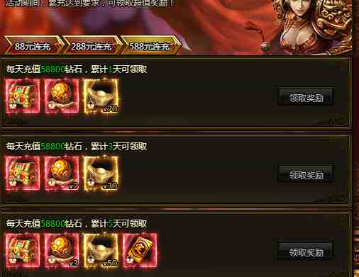 活动期间,每日累计充值达到指定金额即可领取超多奖励!