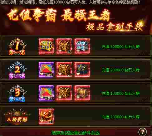 活动期间,最低充值100000钻石可入榜。入榜可参与争夺各种超级奖励!
