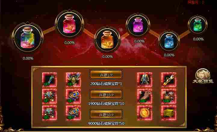 活动期间,许愿即可随机获得珍稀道具奖励且积攒许愿瓶进度,对应的许愿瓶进度满时,可一次性领取许愿瓶内所有奖!